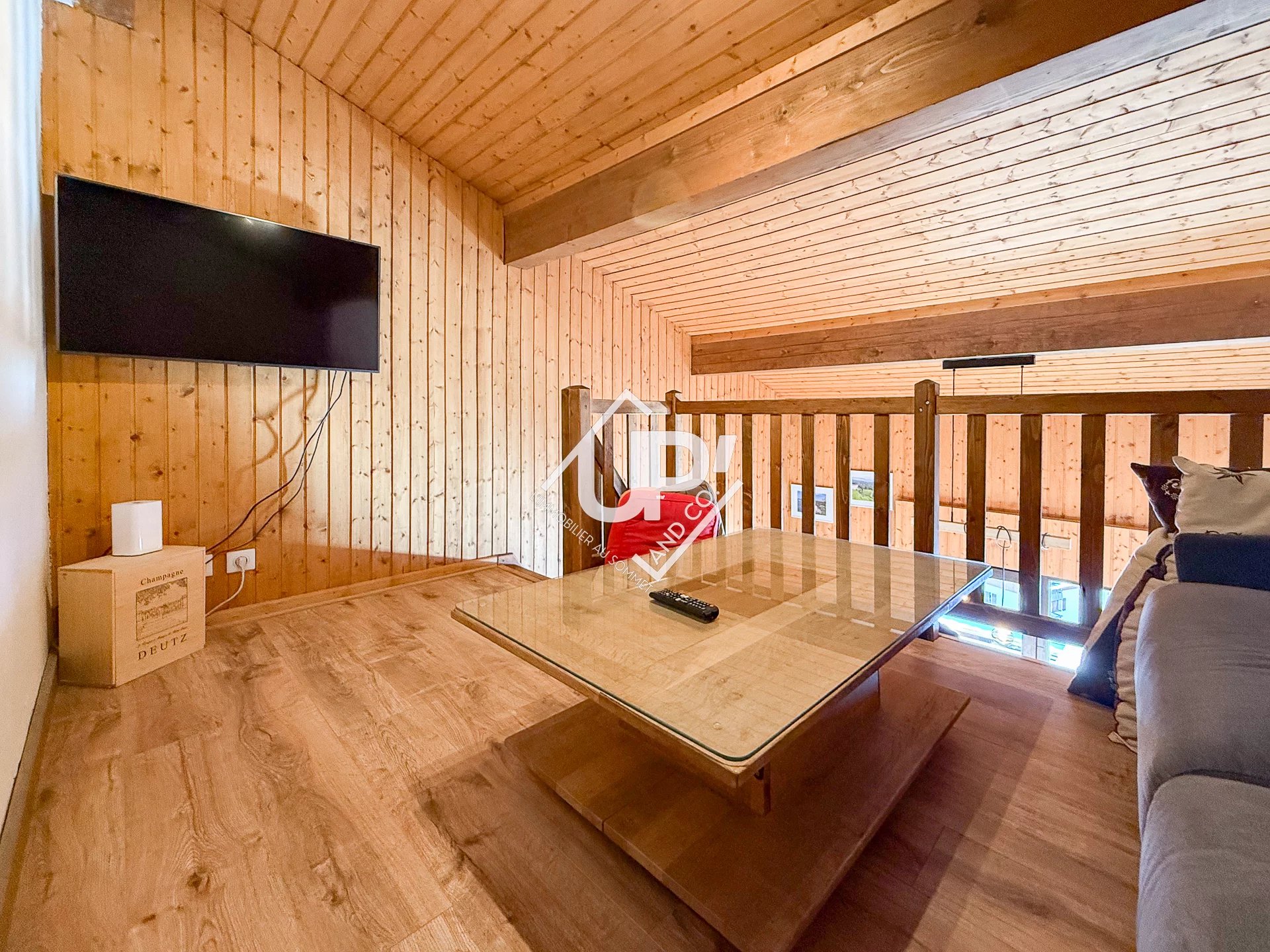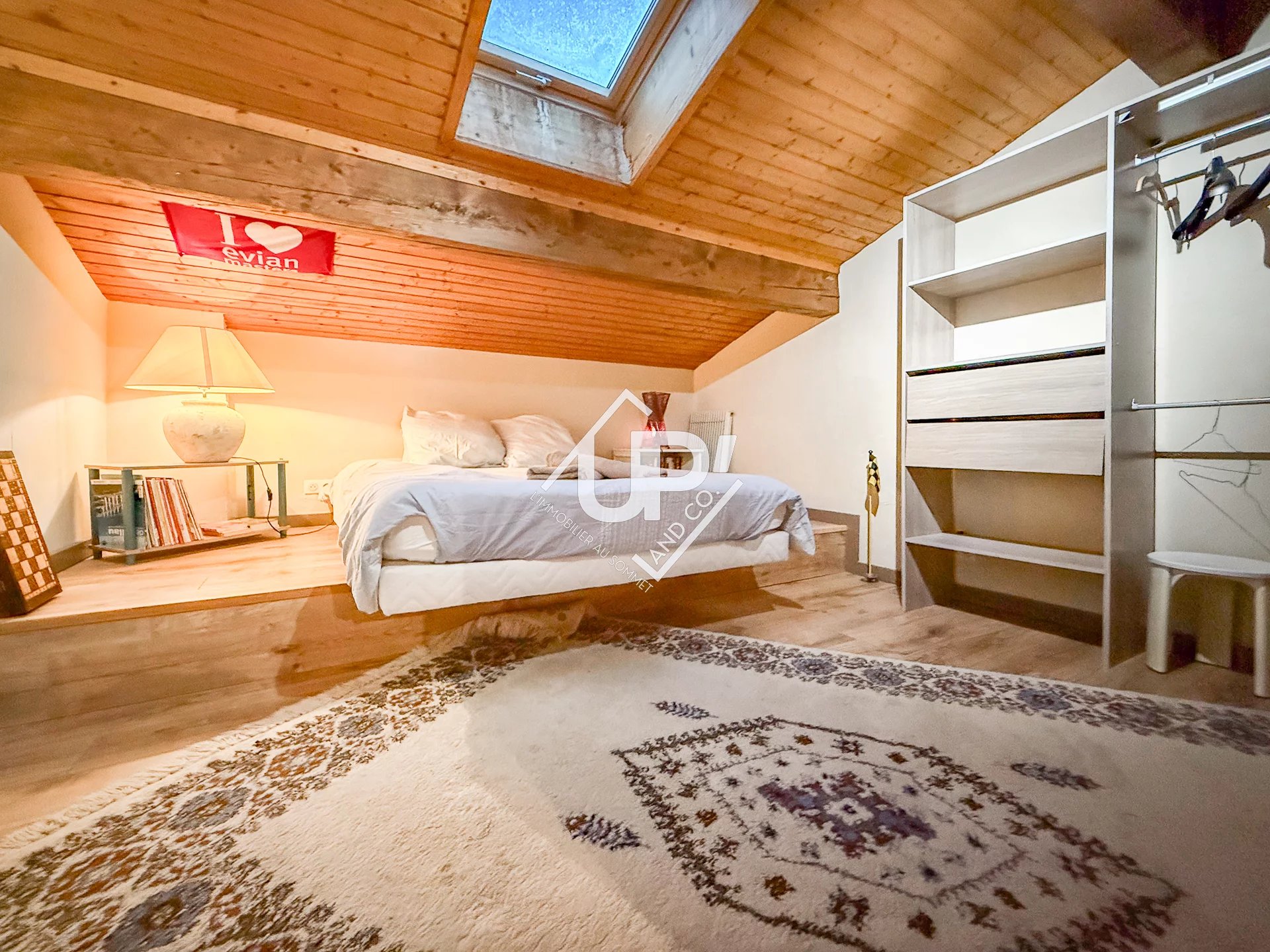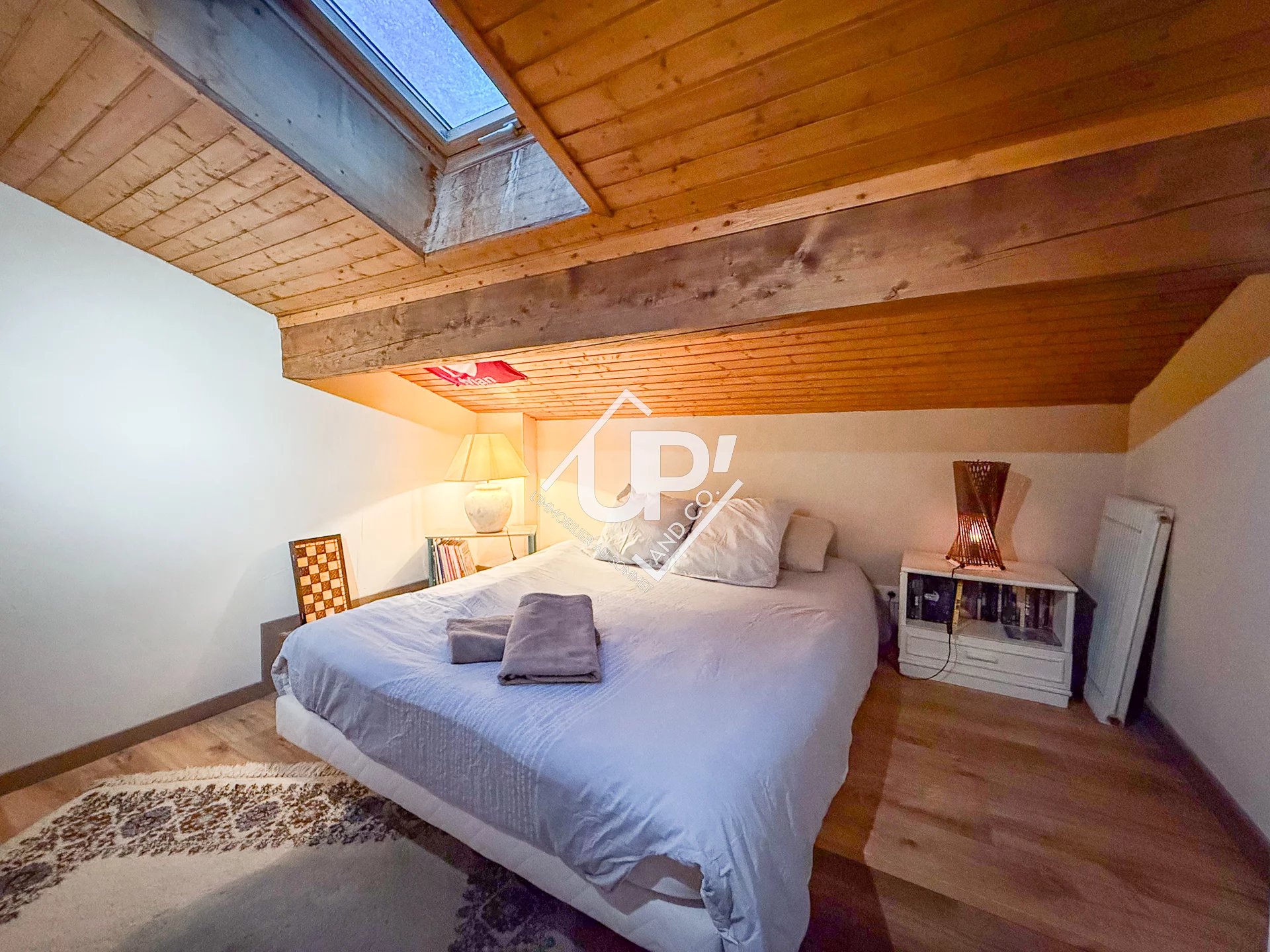 À l'étage, une mezzanine aménagée en salon mène à une spacieuse chambre et à une deuxième salle de douche.